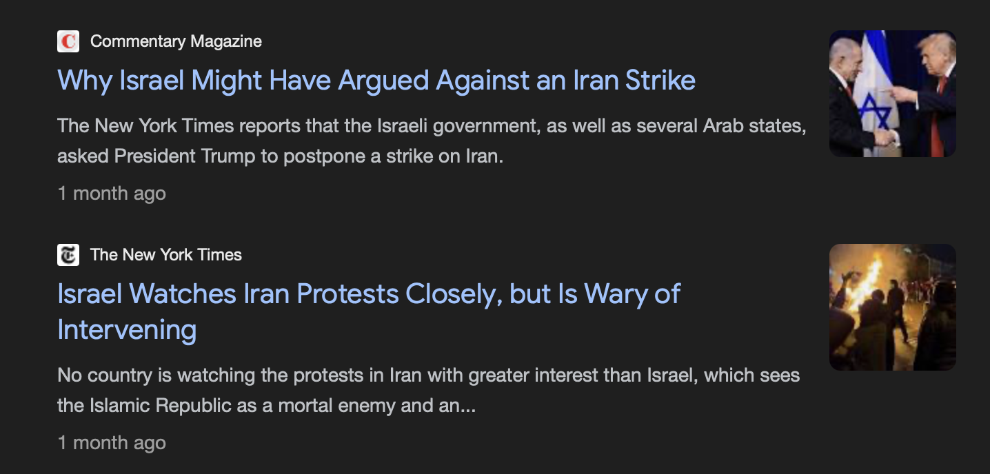 The Israeli government, until less than a month ago, felt that any major strike by the U.S. against the regime would trigger a fresh wave of state executions against key protest organizers. It was only in the weeks following the mass protests, when Iran arrested and executed organizers anyway, that Israel was persuaded to join the U.S. on its most recent strike which killed the ayatollah. So tell me again how any of this is “their war” and not ours.